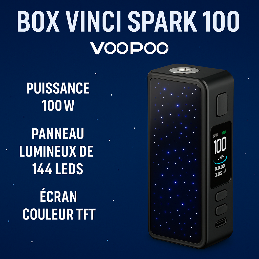 Voopoo frappe fort avec la Vinci Spark 100, une box Ă©lectronique alliant design futuriste et performances avancĂ©es. Avec son panneau lumineux animĂ© par 144 LEDs, elle simule un ciel Ă©toilĂ© pour une expĂ©rience visuelle unique — dĂ©sactivable pour plus de sobriĂ©tĂ© si besoin.